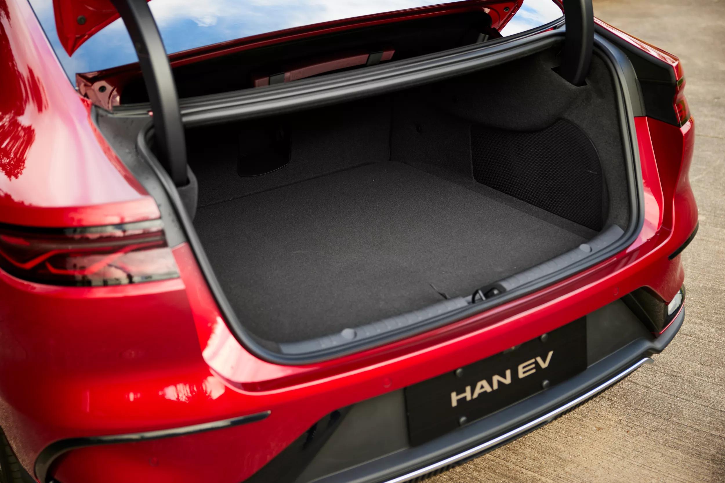 Waar je in de Han ook plaatsneemt, je zit altijd op dezelfde stoelen: de sedan heeft namelijk geen achterbank, maar twee losse zetels achterin. In de middenarmsteun vinden we twee USB-A stroompunten en een tablet, waarop je een groot deel van de functies van het voorste aanraakscherm kunt bedienen. De beenruimte is gigantisch, de hoofdruimte net aan. De rugleuning van de stoelen achterin kan niet plat: de kofferbakinhoud is en blijft daarmee 410 liter. Dat zijn bescheiden afmetingen en het feit dat je onder de laadbodem geen extra spullen kwijt kunt, betekent dat je de laadkabels tussen jouw bagage kwijt moet. De BYD heeft namelijk geen frunk.