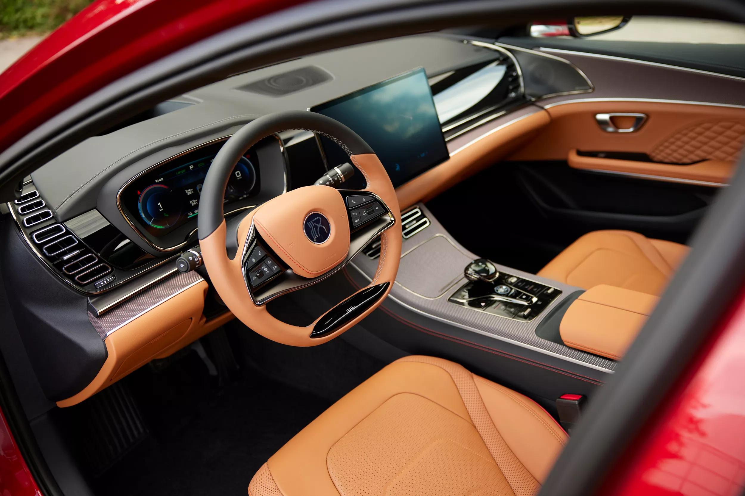 Met zijn cognackleurige, lederen interieur en een 15,6 inch groot infotainmentscherm roept de Han het luxe gevoel op dat je bij auto’s in dit deel van de markt verwacht. Helaas doen sommige bedieningsknoppen die sfeer weer teniet: het inschakelen van de cruise control en het bedienen van de richtingaanwijzers en ruitenwissers zijn dankzij de goedkoop aandoende stengels en druktoetsen geen onverdeeld genoegen. De uit de kluiten gewassen, kunststof luchtroosters weerspiegelen daarnaast hinderlijk in het raam.