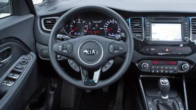 De Carens staat op hetzelfde platform als de Cee’d en heeft grotendeels hetzelfde onderstel. Maar hij is wel langer, hoger en zwaarder, dus de rijeigenschappen zijn niet helemaal hetzelfde. Uiteraard is sportief sturen voor een zevenpersoons MPV niet het allerbelangrijkste. Wat je wilt is comfort, en dat heeft de Carens voldoende te bieden. Hij is mooi stil en schokdemping en vering zijn dik voor elkaar. De 1.6 GDI motor is levendig genoeg, maar je moet wel geregeld terugschakelen om er het maximale uit te halen. De zesversnellingsbak functioneert prima.De Kia Carens van binnen