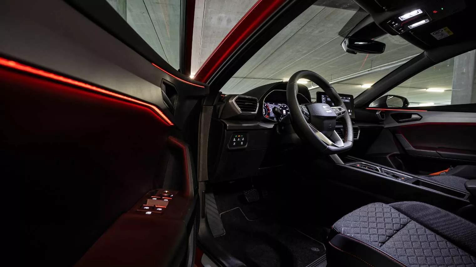 Seat wordt in de markt gezet als de sportiefste telg van het Volkswagen-concern (wanneer je tenminste uitsluitend naar hun grote publieksmerken kijkt). Zeker de Leon heeft een naam voor zichzelf opgebouwd, met dank aan allerhande gepeperde uitvoeringen die inmiddels onder de vlag van een zelfstandige fabrikant worden verkocht (namelijk als Cupra). Aanvankelijk was dat een typenaam, maar het woord prijkt nu op een stel eigen showrooms. Seat heeft de benaming ‘FR’ echter voor zichzelf gehouden. Die letters sierden ook de kofferklep van onze testauto, die was voorzien van een 1.5-liter viercilinder benzinemotor mét een beetje hulp op stroom. Een extra grote, elektrische startmotor maakt namelijk deel uit van deze zogenaamde ‘mild hybrid’ aandrijflijn, zodat de Leon vlotter accelereert zonder meer brandstof te verbruiken. Zien hoe die techniek werkt, doe je niet: er is geen weergave beschikbaar op het dashboard, zoals dat bij andere milieuvriendelijke aandrijflijnen (ook binnen de Volkswagen Group!) wel het geval is. Af en toe duikt er een commando op onder de toerenteller (‘Voet van het gas halen’) en je voelt de Seat soms inhouden wanneer er een voorganger opduikt. Dit type krachtbron is altijd gekoppeld aan een zeventraps automaat met dubbele koppeling, die haast ongemerkt van verzet wisselt. Al tijdens het instappen kan er geen misverstand bestaan over de sportieve aspiraties van de Seat: de zit is laag en de sportstoelen nemen je direct in een stevige omhelzing. Daarnaast is de vering en demping merkbaar stugger dan die van de nieuwe Golf, al moeten we daarbij aantekenen dat een soortgelijke rijbeleving in de Volkswagen slechts een druk op de knop verwijderd is. Steeds meer auto’s hebben een menu met rijstanden, waarmee je zelf invloed kunt uitoefenen op het motorkarakter, de demping en het stuurgevoel. De Leon kan zich op die manier nauwelijks nog onderscheiden, of het moet met een ingenieus deel van de veiligheidsuitrusting zijn. Onze testuitvoering is namelijk voorzien van sfeerverlichting, die niet alleen een decoratieve functie heeft. Welke kleur je ook hebt ingesteld: zodra er zich verkeer in je dode hoek bevindt, kleurt de LED-strip in je deur rood. Hetzelfde gebeurt wanneer je wilt uitstappen, maar de Leon detecteert een fietser of voetganger die door de deur geraakt zou kunnen worden. Soortgelijke techniek is al beschikbaar voor de Audi A7, maar Seat is de eerste fabrikant die het hulpsysteem aan ‘Jan Modaal’ mag aanbieden. Nog zo’n huzarenstukje is de speciale adaptieve cruise control, die niet alleen de camera’s van de Leon benut, maar ook de verkeersinformatie en jouw routekaart als bron raadpleegt. Op die manier kan de C-segmenter op eventuele calamiteiten of obstakels anticiperen. De rest van de aanvullende veiligheidsuitrusting bevat weinig verrassingen: vermoeidheidsherkenning, een noodstopsysteem en actieve rijstrookassistentie zijn op iedere Leon aan boord. Dat laatste had van ons niet gehoeven: de rijstrookassistent van de Seat is dusdanig nadrukkelijk aanwezig, dat we het hulpsysteem liever uitschakelden. Helaas zal je dat elke rit moeten doen, want zodra het contact uit is, begint de Leon opnieuw met ‘armpje drukken’. Met een prijskaartje van minimaal € 990 is een achteruitrijcamera ’n prijzige optie. De accessoire maakt deel uit van een pakket met allerlei comfortverhogende zaken, zoals stoel- en stuurverwarming. De belangrijkste reden om die meerprijs te betalen, is echter het matige zicht vanachter het stuur.
