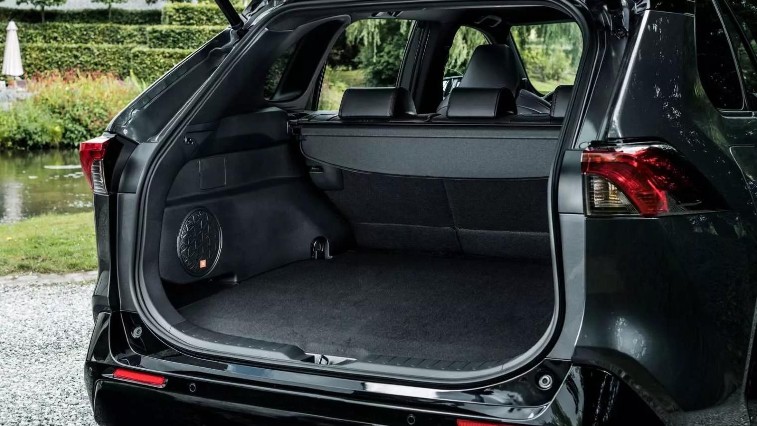 Het blijft een leuk detail: de draaiknoppen aan boord van de semi-elektrische RAV4 hebben een bandenprofiel, om het ‘ruige’ karakter van de crossover te onderstrepen. Je kijkt uit op een deels digitaal instrumentarium, met een infotainmentscherm dat aangenaam hoog op de middenconsole is geplaatst. Jammer dat deze Toyota nog niet profiteert van het nieuwe type navigatiekaart, zoals die in de kleinere Yaris Cross inmiddels leverbaar is. Dat systeem biedt een volwassener uiterlijk dan de ‘kleurplaat’ waarop je nu naar jouw plaats van bestemming wordt gedirigeerd. De in- en uitstap is uitmuntend, met meer dan genoeg hoofd- en beenruimte op de achterbank waar je terecht komt. De rugleuning kun je individueel verstellen. Om onduidelijke redenen is de middentunnel bekleed met hard, glimmend kunststof. Als de middelste inzittende daar één keer zijn of haar schoenen op parkeert, heb je meteen krassen. Voor de achterpassagiers is wel voorzien in eigen ventilatieroosters en stroompunten. In de kofferbak vinden we er daarvan ook twee, waaronder een volwaardig stopcontact! Onder de bagagebodem gaat geen extra opbergruimte schuil, waardoor de voor deze uitvoering benodigde laadkabels door de kofferbak slingeren. Klap je de rugleuning van de achterbank neer, dan ontstaat er een vlakke laadvloer. De laadruimte bedraagt minimaal 490 liter; 90 liter minder dan je bij de andere motorvarianten van de RAV4 kwijt kunt.