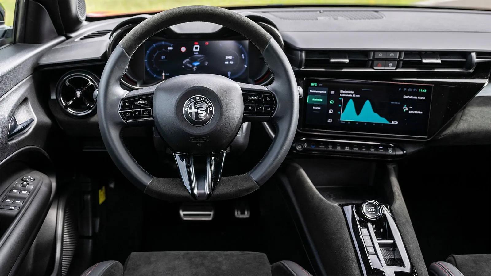 De besturing biedt, zoals zoveel EV’s, bitter weinig gevoel. Dat gezegd hebbende is de directheid waarmee de stuurinrichting reageert wel goed. Je voelt een vleugje van Alfa Romeo’s verleden, maar dat gebrek aan gevoel gooit ook meteen weer roet in het eten, net als het feit dat de auto wat overhelt in snel genomen bochten. Het zicht rondom wordt wat beperkt door de forse voorste raamstijlen. Verder is er op snelwegtempo veel bandengeruis hoorbaar.