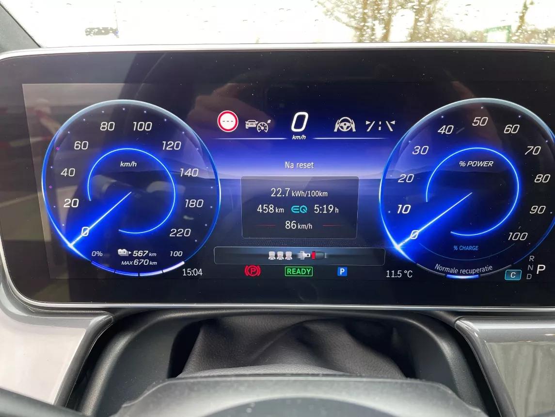 Een indrukwekkend staaltje techniek, die intelligente recuperatie. Helaas werkt het lang niet altijd. Bovendien reageert de Benz onbeholpen wanneer jij op het laatste moment liever zelf de controle overneemt. De schok die dan door de auto heen gaat, past niet bij een personenwagen van dit kaliber. Een waarde die in de folder vermeld wordt en wel degelijk op waarheid berust, is de maximale laadsnelheid. Die 200 kW wisten we zelfs te overtreffen! Voorwaarde is wel, dat je de Mercedes vooraf laat weten dat je wilt (snel)laden door de laadstop als bestemming in te voeren. Een peulenschil, aangezien die op prijs én laadtempo in het navigatiesysteem staan opgeslagen. De batterij wordt dan gepreconditioneerd om zulke hoge snelheden aan te kunnen. Zelfs bij een driekwartvolle batterij laadt de Benz nog altijd met meer dan 130 kW. Dankzij een geïntegreerde betaalmodule hoef je vooraf niet eens een laadpasje aan te bieden: de paal verrekent de opgenomen stroom direct met de auto, waarna je van Mercedes een rekening thuisgestuurd krijgt.
