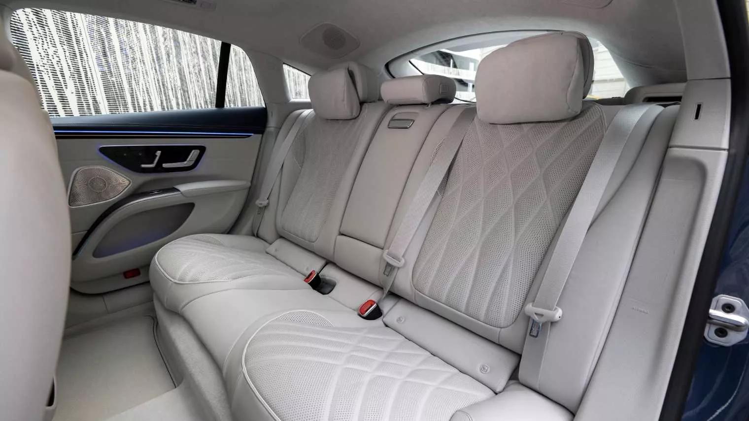 Om de luchtweerstand zo laag mogelijk te houden, heeft Mercedes gekozen voor een druppelvorm die de hoofdruimte op de achterbank nadelig beïnvloedt. De achterbank staat ook laag in de auto, waardoor je weinig steun aan je benen ervaart. De beenruimte is echter riant, geholpen door een wielbasis die flink groter is dan die van een Mercedes S-Klasse. Bovendien ontbreekt een middentunnel. Daarnaast heeft de elektrische limousine een grote vijfde deur, wat resulteert in een beter toegankelijke – en veel grotere! – kofferbak. Die heeft een inhoud van minimaal 610- en maximaal 1.770 liter. Klap je de achterbank neer, dan ontstaat er geen vlakke laadvloer: waar de bagagebodem overgaat in de rugleuning, ontdekken we een bult. Onder de vloer bevindt zich een mooi diep vak, waar je zo nodig verschillende laadkabels kwijt kunt. Voorin gaat dat niet: hoewel de EQS uitsluitend als elektrische auto wordt aangeboden, gaat alle ruimte onder de traditionele motorkap op aan een ingenieus luchtfilter. Tegen meerprijs kun je zowel voor- als achterin draadloos je mobiele telefoon opladen en mede de temperatuur bepalen.