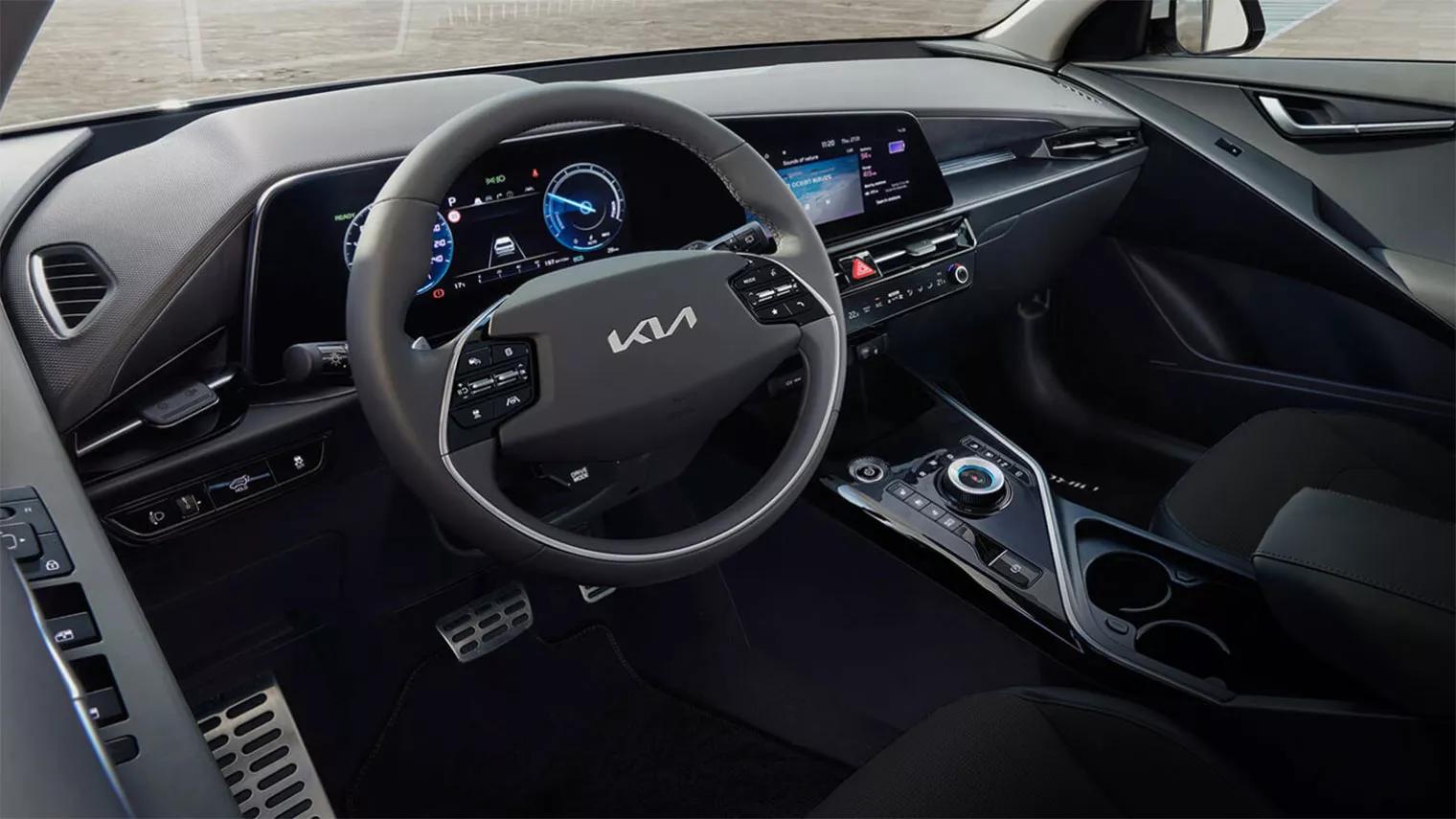 ‘Onze’ Kia Niro heeft een extra groot infotainmentscherm van 10,25 inch groot en een 10-inch head-up display. Dat aanraakscherm is trouwens niet de snelste die we kennen. En soms moet je twee keer drukken voordat er iets gebeurt. De symbooltjes zijn tevens nogal klein. Verder is het wel erg somber aan boord door al het zwart en de materiaalkeuze is aan de goedkope kant. Kijk maar naar bijvoorbeeld de deurbekleding. Das loeihard plastic dat niet thuishoort op een auto van 32 tot ruim 40 mille. De belangrijkste bedieningen voor radio en airco zitten in een apart schermpje. Met een knop switch je tussen radio en kachel. Handig: met één druk op de knop zijn ramen en achterportieren vergrendeld voor de kinderen achterin (geen gehannes meer met sleuteltjes). Over zitten gesproken; de zit achter het stuurwiel is wat ongemakkelijk hoog. Kia had tijdens de introductie nog verteld dat dat bij de EV uiteraard het geval was door het batterijpakket wat er onder schuilgaat. Maar dat dat bij de normale hybride lager zou zijn. Niet dus. Ben je wat kleiner dan is het misschien wel oké, maar als je lang bent – zoals veel Nederlanders – dan lijkt het net of het dashboard op je knieën rust.