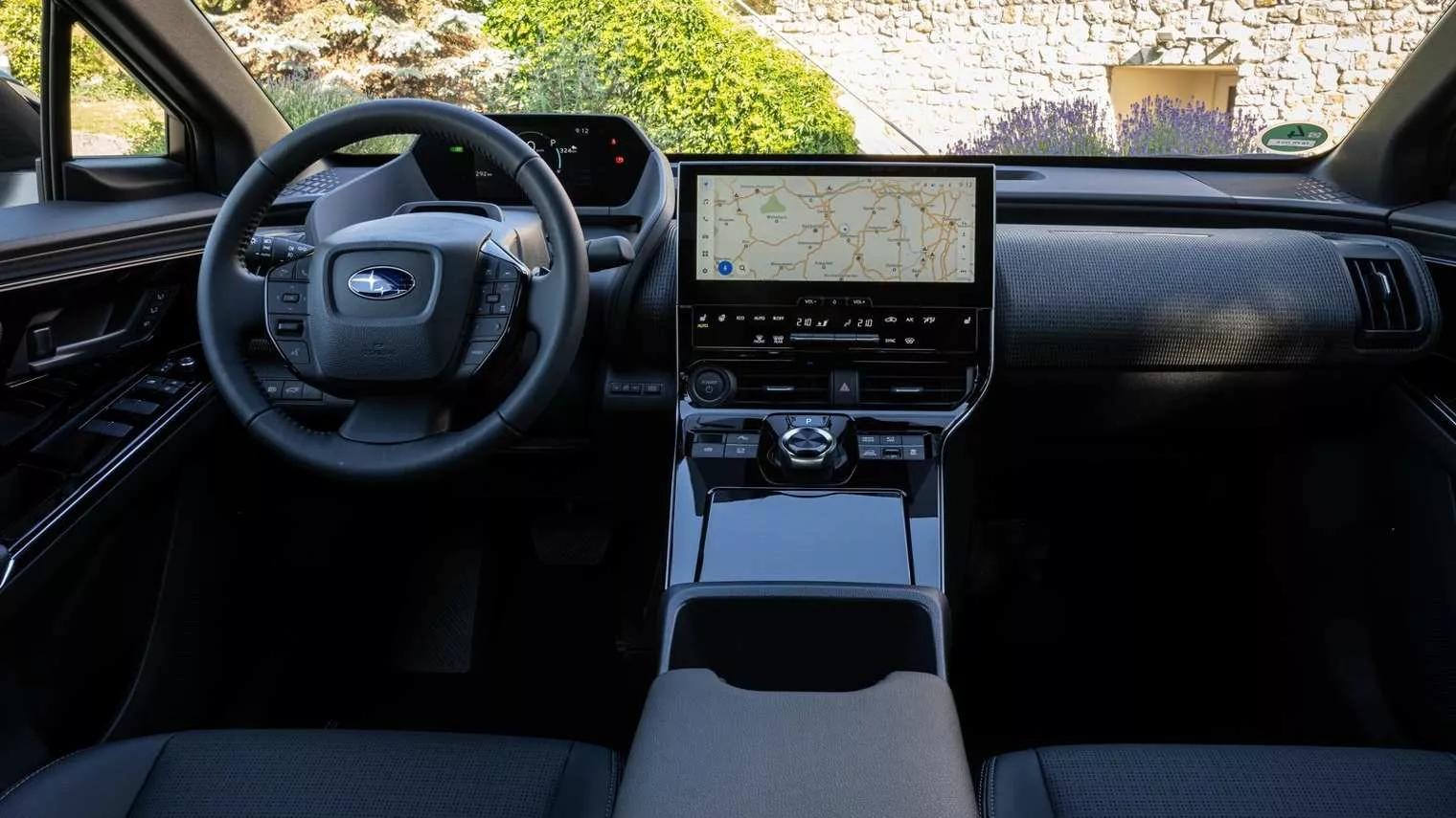Wat de Ariya te veel heeft aan uitrusting, ontbeert de Solterra. Het interieur is opgetrokken uit harde kunststoffen, die in de hagelnieuwe testauto al kraakten. De Subaru toont op de kaart van het navigatiesysteem weliswaar waar je laadpalen kunt vinden, maar je moet zelf maar uitvogelen welke stops je onderweg moet maken. Een dashboardkastje ontbreekt, waardoor het vuistdikke instructieboekje noodgedwongen verhuist naar de middentunnel. We missen een achterruitenwisser en de crossover laat ook niet zien welk percentage stroom er nog in de batterij resteert. Onder een bepaald minimum verandert het aantal kilometers vaak in drie streepjes verandert: juist dan is het cruciaal om zo’n percentage te kunnen aflezen!