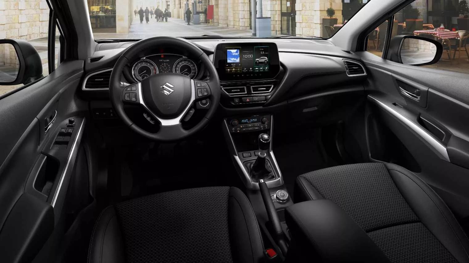 De nieuwe S-Cross heeft veel weg van zijn voorganger. Toch is de semi-terreinwagen helemaal nieuw, op het dak, de aandrijflijn en het interieur na;daarvoor is dezelfde mal gebruikt. Alleen het infotainmentscherm heeft een andere plek gekregen: dat prijkt voortaan bovenaan het dashboard. De gebruikte bouwmaterialen zijn nog altijd van knalhard plastic en glimmen bovendien. Het instrumentarium is grotendeels analoog: dat betekent veel knoppen en een traditionele klokkenwinkel. Het oogt mminder modern, maar je kunt alle functies wel eenvoudig bedienen.