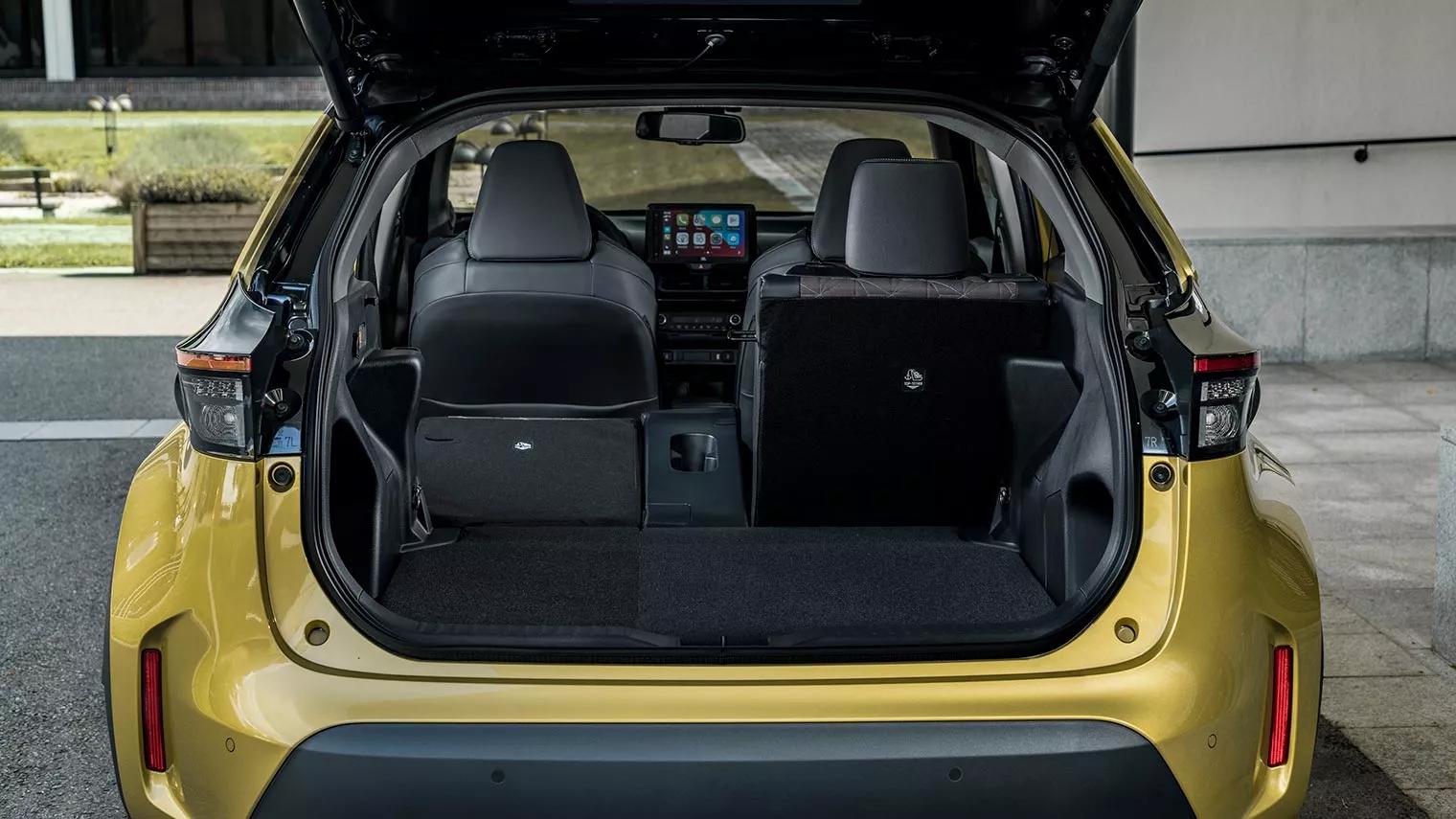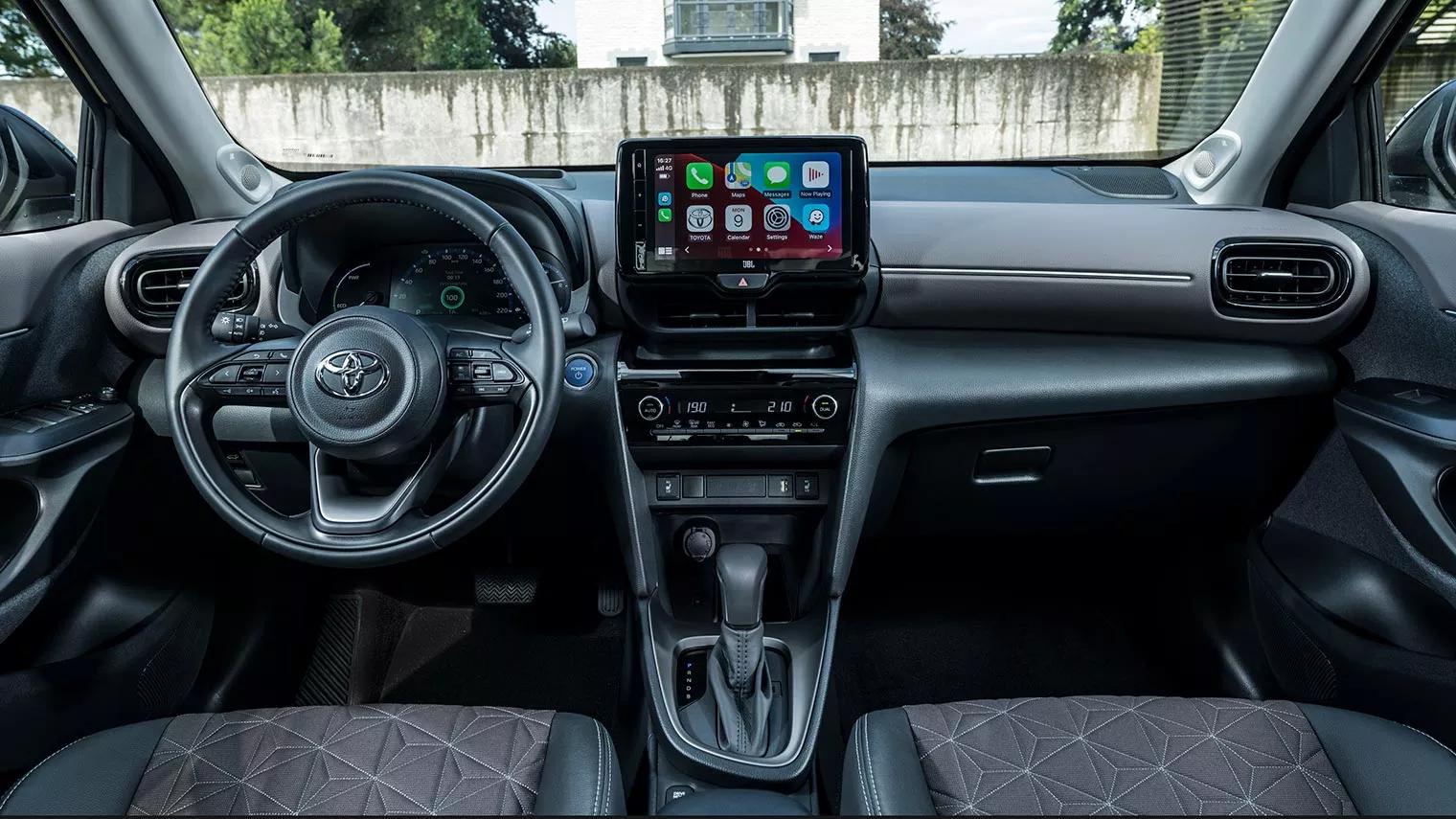 Wat altijd op de Toyota Yaris Cross zit is een automatische airco en een zeer uitgebreid pakket actieve rijhulpsystemen. We noemen een rijstrookassistent, een noodstopsysteem dat voetgangers en fietsers herkent, óók in het donker, verkeersbordherkenning en adaptieve cruise control. De hybrideversie heeft altijd een automaat. En vanaf het tweede uitrustingsniveau heb je ook altijd een achteruitrijcamera – al is de resolutie van het beeld wat aan de karige kant. Onze testauto heeft dan ook nog Apple Carplay en navigatie. Zo’n uitrusting was een jaar of vijf geleden voor dit type auto nog ondenkbaar. Wat niet zo goed is geregeld, is de instap achterin deze Toyota. De achterdeuren gaan maar een klein stukje open en je moet je dan ook nog door een kleine doorgang persen. Zit je eenmaal dan heb je niet echt veel beenruimte. De hoofdruimte is trouwens wel goed. Voorin is het een stuk ruimer. Een groot, duidelijk afleesbaar infotainmentscherm en een digitaal instrumentarium. Alleen het zicht schuin naar achteren is echt slecht en de zittingen van de stoelen zijn nogal kort.