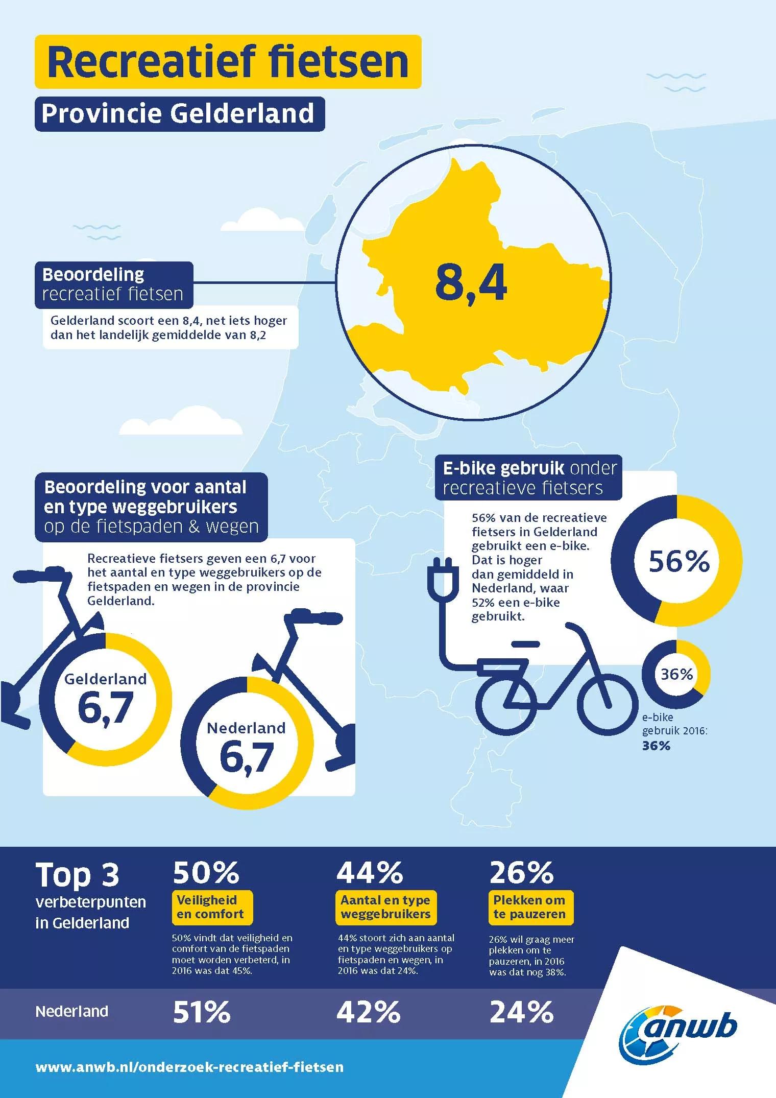 Hoe beoordelen recreatieve fietsers het fietsen in Gelderland en welke verbeterpunten zien zij om de ideale fietstocht in Gelderland mogelijk te maken? Je ziet het in de infographic hieronder. De infographic en het hele rapport kun je onderaan de pagina downloaden.