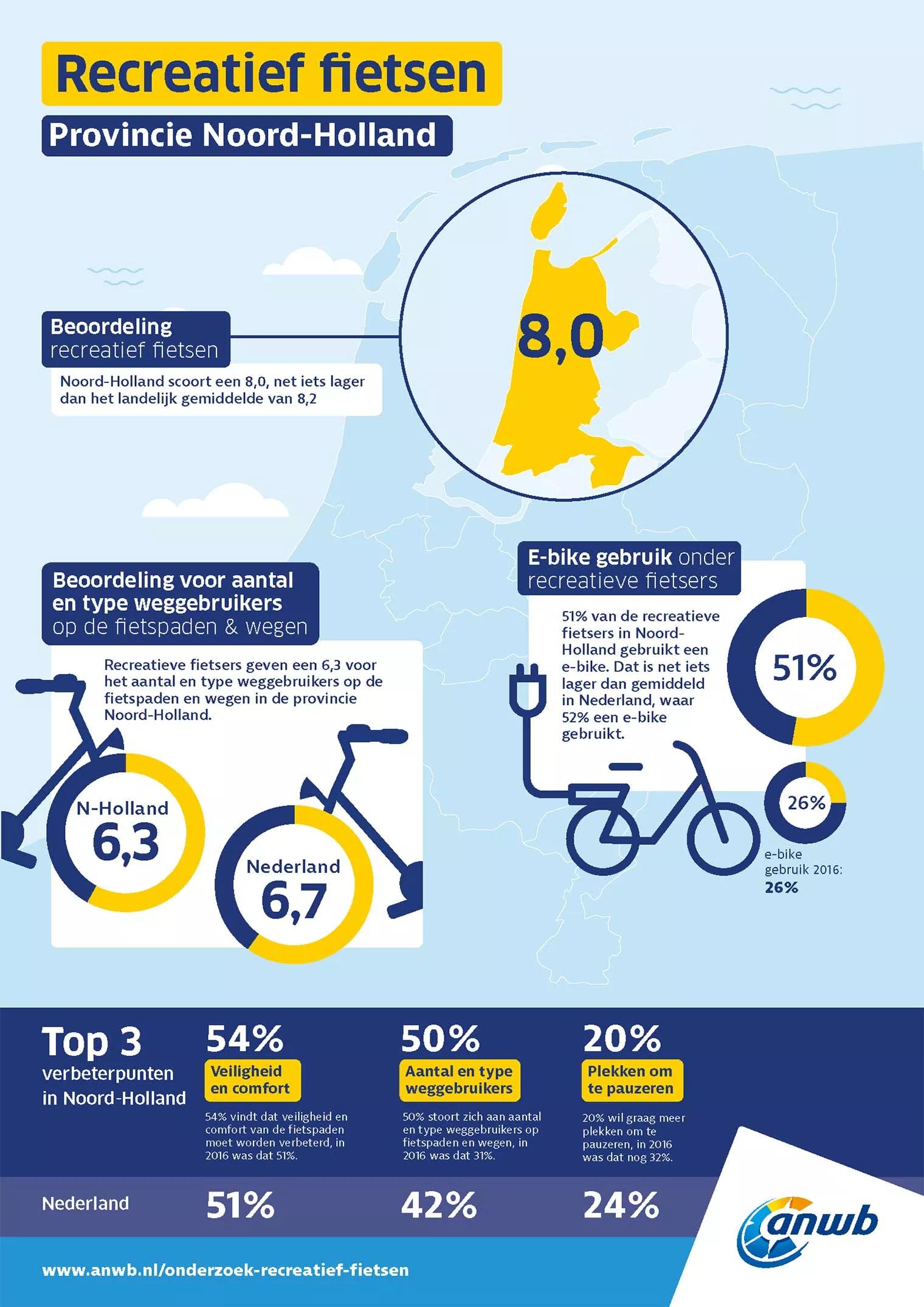 Hoe beoordelen recreatieve fietsers het fietsen in Noord-Holland en welke verbeterpunten zien zij om de ideale fietstocht in Noord-Holland mogelijk te maken? Je ziet het in de infographic hieronder. De infographic en het hele rapport kun je onderaan de pagina downloaden.
