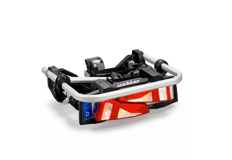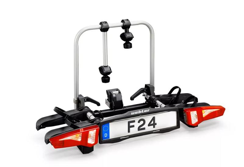 Dat het altijd lichter en gemakkelijker kan, bewijst Uebler met de F24 fietsendrager. Met slechts 12 kilogram op de teller is dit de lichtste fietsendrager in zijn soort. Om tot genoemd gewicht te komen, heeft Uebler wel een concessie moeten doen, de drager is namelijk niet kantelbaar. Maar daar staan dus wel belangrijke voordelen tegenover. Het pronkstuk van de F24 is de iQ sluiting, een super handige kogelkoppeling. De F24 wordt compleet afgemonteerd geleverd, alleen de frameklemmen worden los meegeleverd. In opgevouwen toestand is de drager zeer compact en door het lage gewicht eenvoudig te hanteren. Na koppeling op de kogel wordt eerst het U-profiel voor de frameklemmen opgeklapt, daarna volgen de wielgoten met verlichtingsunits. Vergrendeling en frameklemmen zijn voorzien van een slot.