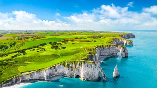 Steile 70 meter hoge krijtrotsen begrenzen aan weerskanten het kiezelstrand van Étretat en behoren tot de bekendste bezienswaardigheden van Normandië. De kliffen zijn vanaf de zee en het strand gezien wit, maar op de winderige vlaktes bovenop bedekt met lage vegetatie als zeevenkel. Deze typerende krijtkusten, tussen de plaatsen Le Havre en Le Tréport, zijn gemiddeld 100 miljoen jaar geleden gevormd uit samengeperste microscopische skeletten van zeedieren.