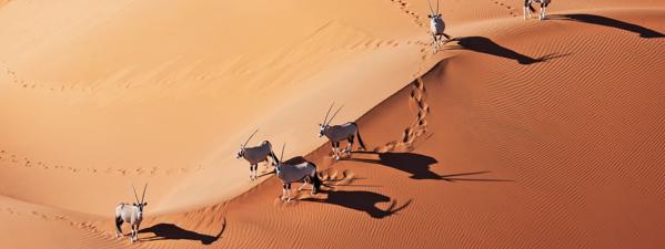 Ervaar de verlatenheid van de zandwoestijn in de immense Namib Desert. Deze beslaat met een lengte van 1200 kilometer en een breedte van 160 kilometer het hele westen van het land. De zandduinen zijn hier meer dan 300 meter hoog. Beklim Duin 45 voor een weids uitzicht. In het oosten van het park ligt de Sossusvlei met de Sesriem Canyon, uitgeslepen door de Tsauchab-rivier. Alleen na regenval zijn er nu wat poeltjes in de canyon over. Sesriem Canyon is 1 kilometer lang, 30 meter diep en maar 1 tot 3 meter breed. Daal te voet af in de kloof en bekijk de grillige rotsformaties van dichtbij.