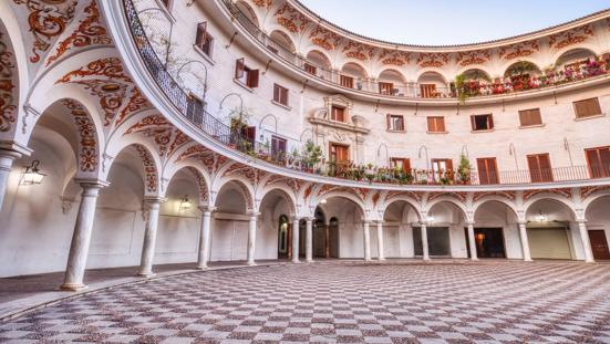 Het is even zoeken, maar vlak bij de kathedraal ligt Plaza del Cabildo. Een verborgen parel is het, dit kleine plein met een halfrond gebouw met marmeren zuilen en mooie fresco’s. In de 16de eeuw stond hier een prestigieuze school, het Colegio de San Miguel. Opgericht door het kapittel van de kathedraal. Die werd rond 1950 afgebroken, maar de voorkant met uitzicht op de Avenida de la Constitución is bewaard gebleven. Het drie verdiepingen tellende gebouw dat er nu staat, heeft een halve cirkelvorm. Ontworpen door architect Joaquín Barquín Barón. Je oog trekt al snel naar de arcades, die zijn versierd met prachtige fresco’s van de Sevilliaanse schilder José Palomar.