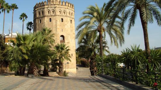 Deze 36 meter hoge toren werd in de 12de eeuw gebouwd door de Almohaden, als onderdeel van de Moorse stadswal. De toren diende ooit als verdediging tegen vijandige schepen. Onder water van de Gualdaquivir lag een zware ketting naar de overkant om ze te verhinderen de rivier op te varen. In de bloeitijd van Andalusië, in de 16de eeuw, werden in het met goudkleurige tegels Torre del Oro de goederen uit Amerika opgeslagen. Vaak was het een lading goud, vandaar ook de naam ‘gouden toren’.