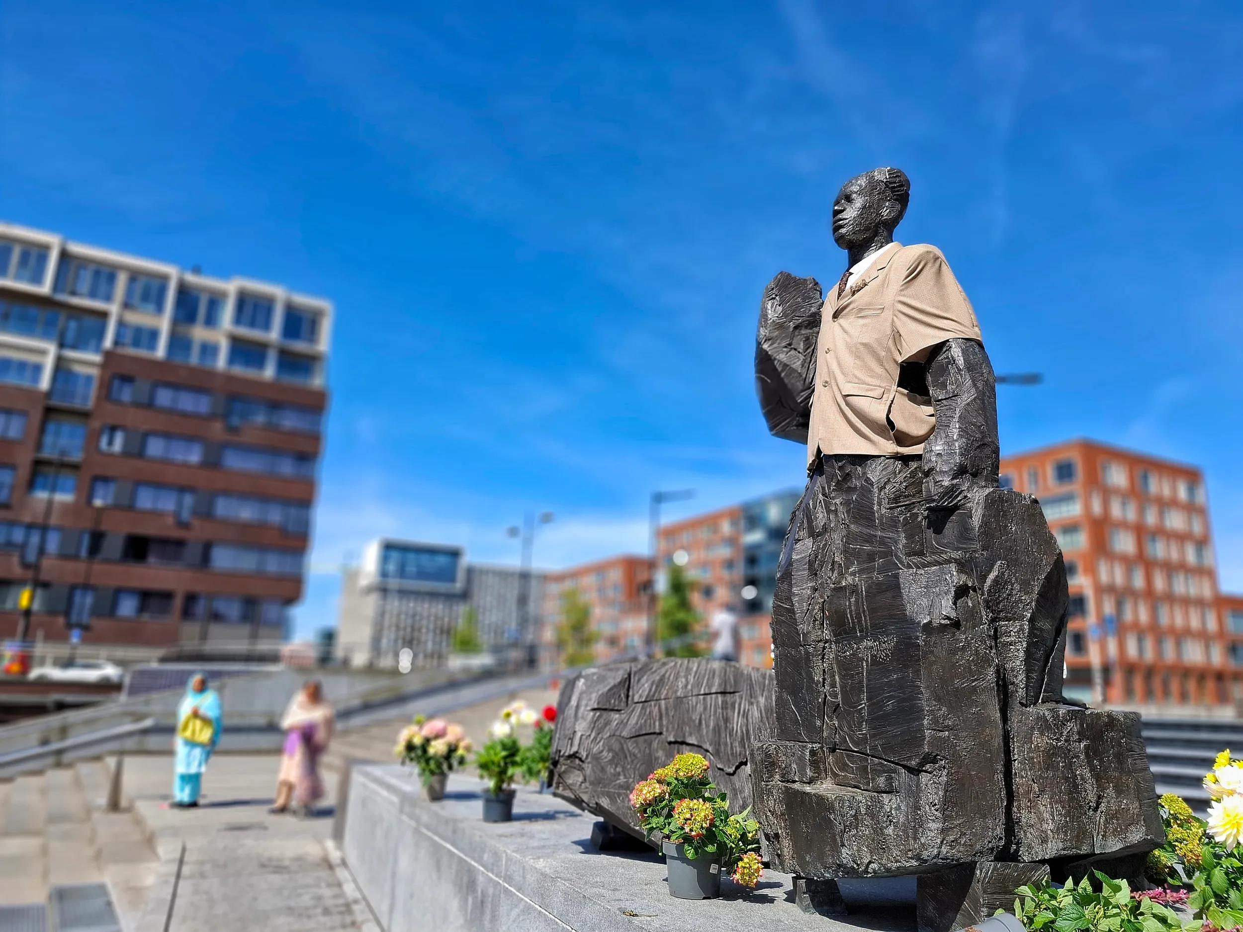 Anton de Kom (1898-1945) was een Surinaamse schrijver, activist en verzetsstrijder die streed tegen kolonialisme, racisme en sociale ongelijkheid. Zijn boek ‘Wij slaven van Suriname’ was een aanklacht tegen de Nederlandse koloniale overheersing. Tijdens de Tweede Wereldoorlog sloot hij zich aan bij het Nederlandse verzet. In 1944 werd hij gearresteerd door de nazi’s en gedeporteerd naar concentratiekampen. Hij overleed kort voor het einde van de oorlog in Kamp Sandbostel. Op het plein dat naar hem genoemd is staat, bovenaan de trap, een prachtig beeld van Anton de Kom, ontworpen door Jikke van Loon. Het beeld zorgde voor controverse: sommigen vonden het beeld krachtig en kwetsbaar, anderen zagen in de naakte figuur een ongepaste verwijzing naar de slavernij. Bovendien: Anton de Kom was juist een man die zich goed en zorgvuldig kleedde. Dit bracht rapper, dichter, acteur en omroepdirecteur Akwasi er in 2025 toe het beeld (tijdelijk) aan te kleden (zie foto). Op het Anton de Komplein is op maandag, donderdag en vrijdag markt.