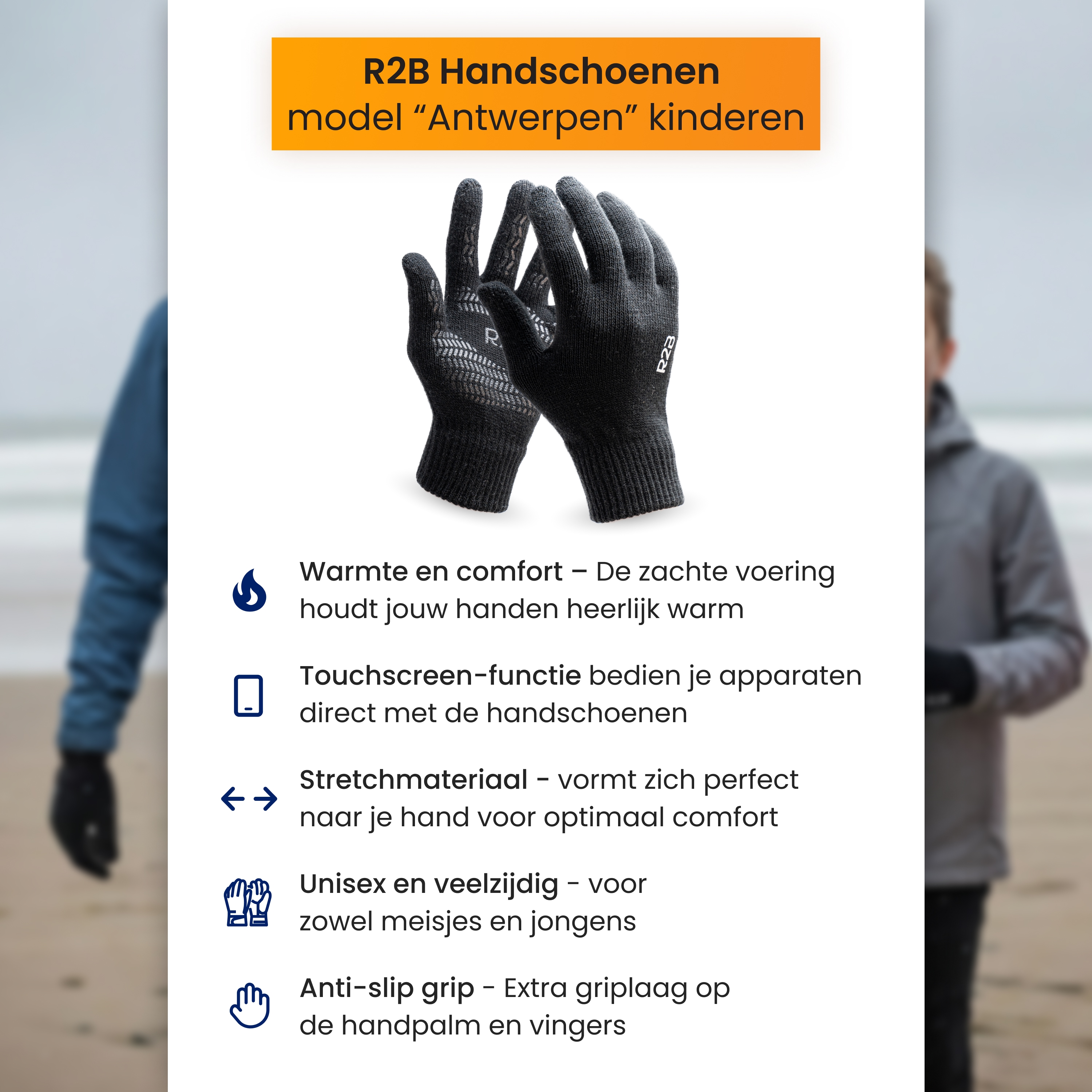 - Warme unisex touchscreen handschoenen "Antwerpen" voor kinderen. Flexibel materiaal, met anti-slip voor grip en zachte voering. Blijf telefoon en tablet bedienen zonder koude handen. Geschikt voor jongens en meisjes!