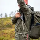 Alle kleine details voor actief buiten zijn, zijn natuurlijk aanwezig; speciale borstzakken voor communicatieapparatuur met antenne-uitgang en lus om de antenne op zijn plaats te houden. Dezelfde zak heeft ook een oortelefoonuitgang die is verbonden met een elastische lus die je oortelefoon op zijn plaats houdt. Om ervoor te zorgen dat de jas even bruikbaar is voor linkshandige gebruikers, hebben de zakken aan beide zijden van de borst dezelfde functionaliteit. Als je een Garmin houder gebruikt, vind je hiervoor ook bevestigingsmogelijkheden op de voorkant van de jas. Wanneer de activiteit intens wordt en je maximale ventilatie nodig hebt, vind je lange ventilatieritsen onder de armen. De ventilatieritsen zijn ook zo aangebracht dat de jas ook als poncho gedragen kan worden.