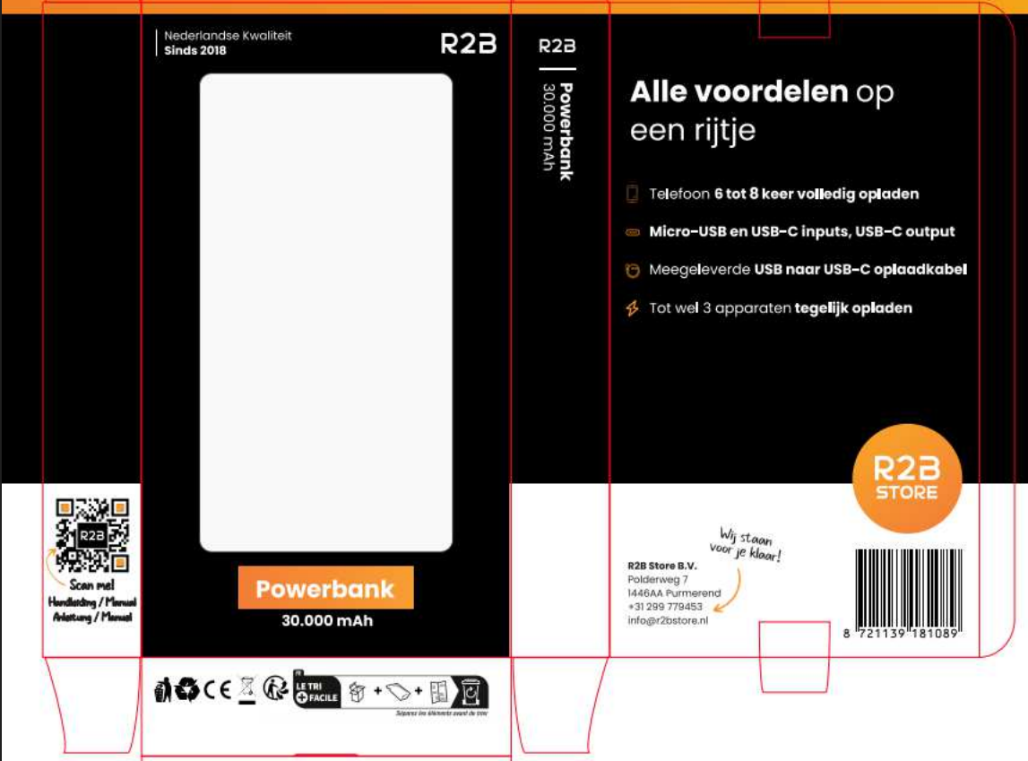 - 30.000 mAh capaciteit – Geschikt om apparaten meerdere keren op te laden.