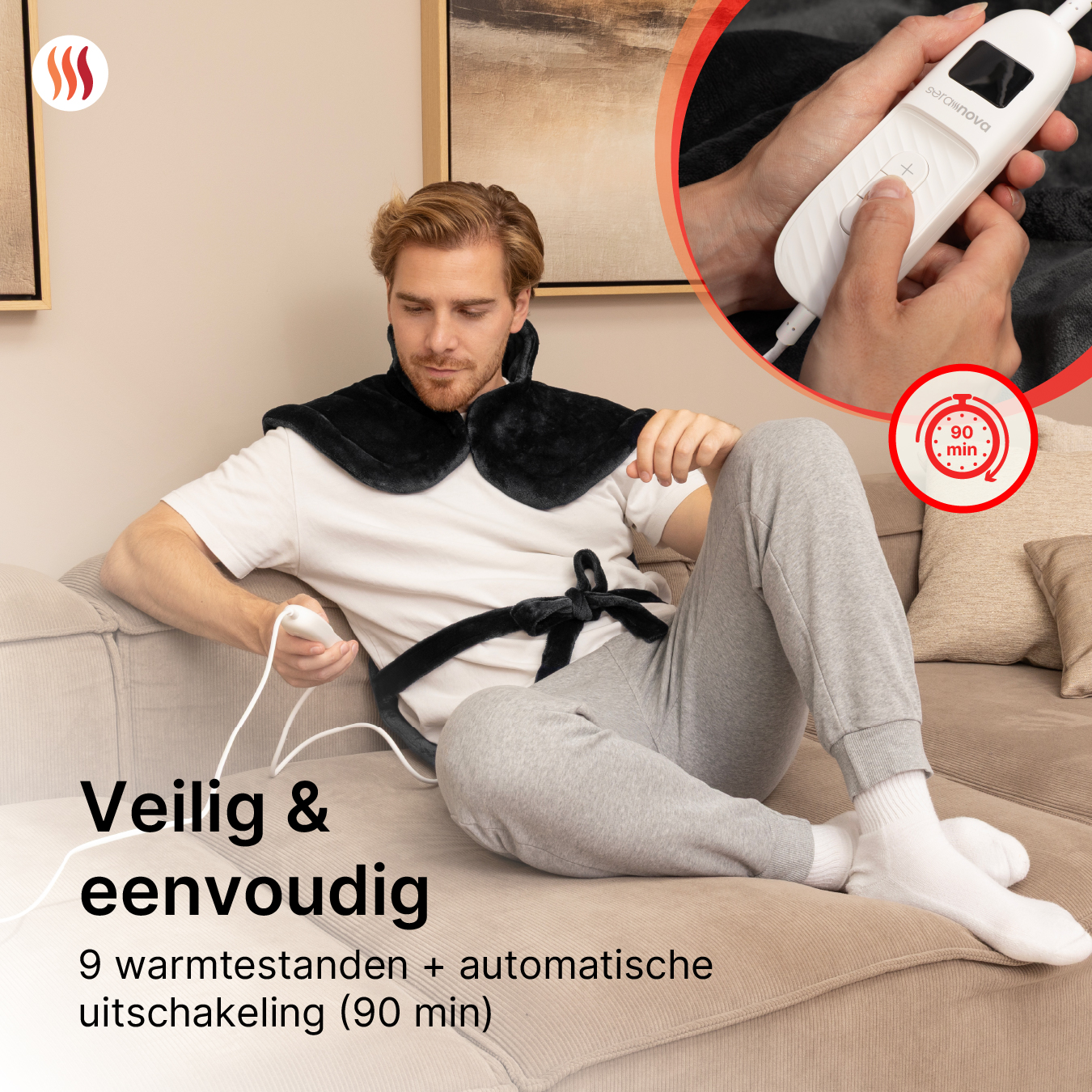 Het royale formaat van 60 × 85 cm zorgt ervoor dat je hele schouder- en ruggebied tegelijk wordt verwarmd. Binnen enkele minuten warmt het kussen op tot een comfortabele 37–38 °C. Met 9 instelbare warmtestanden kies je eenvoudig de intensiteit die jij prettig vindt. Na 90 minuten schakelt het apparaat automatisch uit, zodat je altijd veilig en zorgeloos kunt ontspannen.