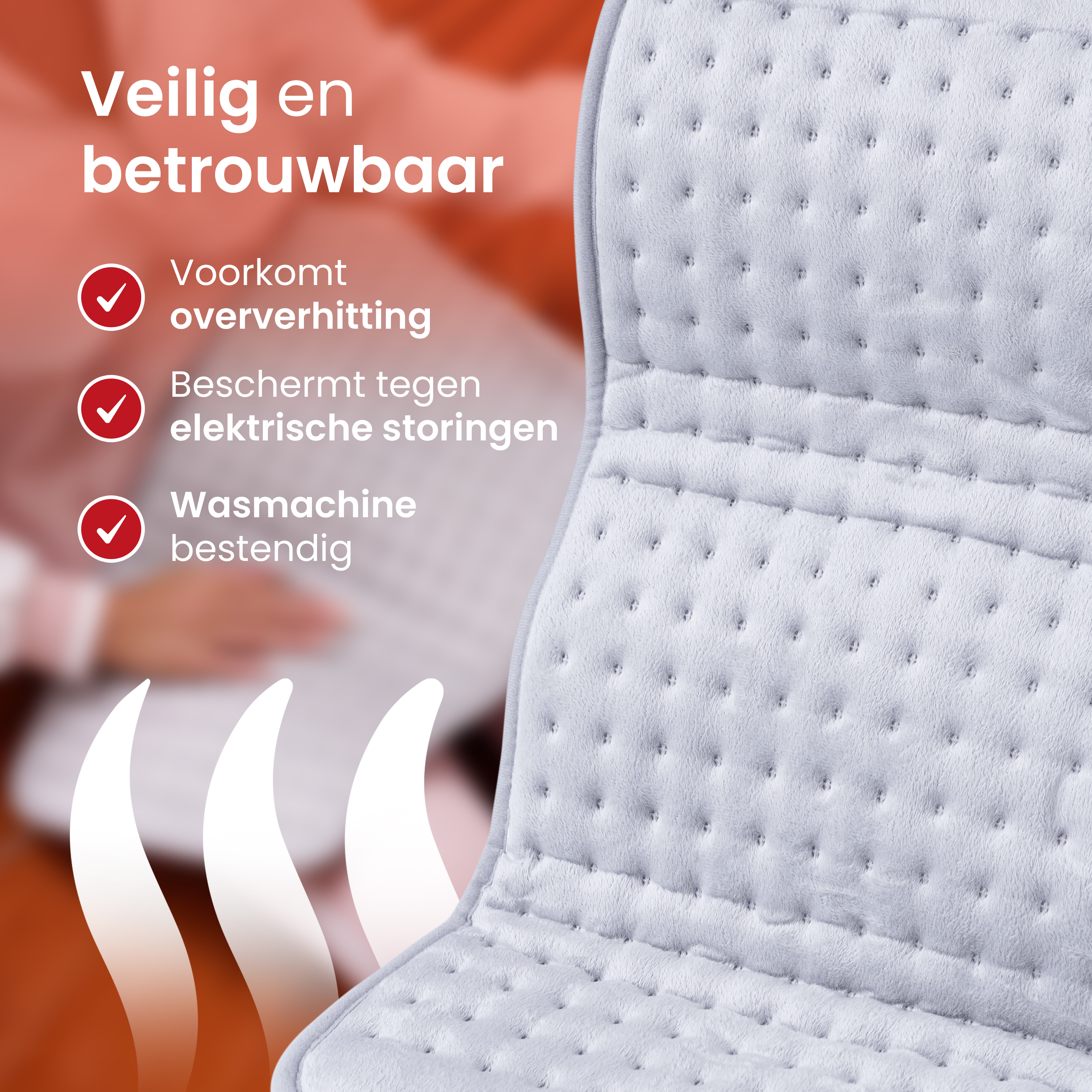 Het royale formaat van 60 × 30 cm maakt het geschikt voor gebruik op rug, nek, buik, benen, schouders en voeten. Het zachte fleece voelt comfortabel aan op de huid en ventileert goed, waardoor de warmte altijd aangenaam blijft. Dankzij de automatische uitschakeling na 90 minuten en de ingebouwde oververhittingsbeveiliging gebruik je het kussen veilig en zorgeloos.