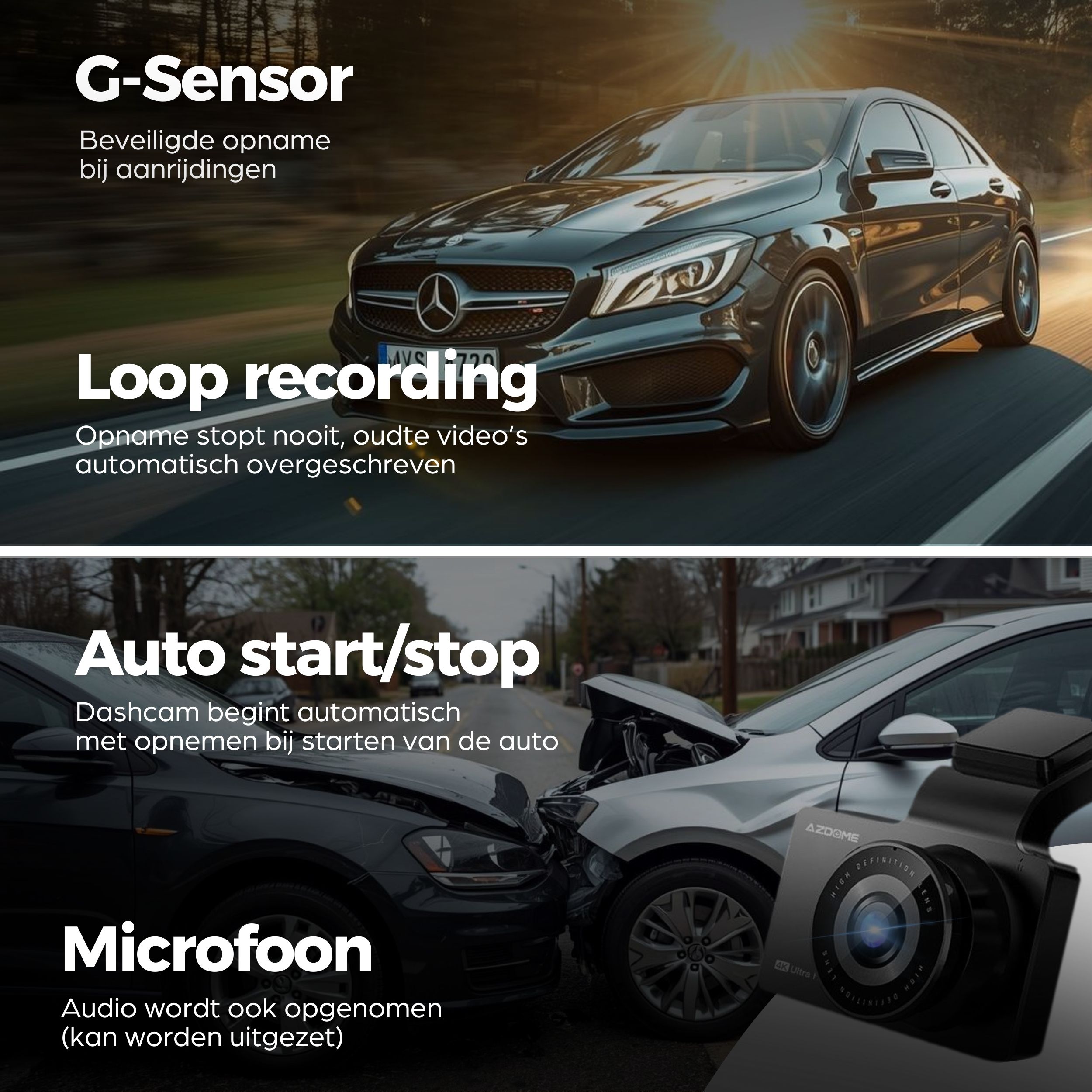 De AZDome M63 Lite is een instap model dashcam met alles aan boord om al je ritten vast te leggen. Deze Lite versie van de M63 Lite beschikt over een groot 3,0 inch LCD en Wifi. Hij neemt op in 4K resolutie en optioneel is een achter camera aan te sluiten. De Lite versie van de AZDome M63 heeft geen GPS en er wordt standaard geen Micro SD kaart bij geleverd. Ultra 4K resolutie De AZDome M63 Lite dashcam is uitgerust met de recentste 8.0MP beeldsensor die garant staat voor de scherpste Ultra 4K video's. Hij filmt met een resolutie van 3840p*2160p in 25fps, maar je kunt hem ook op FullHD 60fps laten opnemen. De HDR technologie staat garant voor een perfecte beeldkwaliteit bij alle weersomstandigheden. Tevens kan met de dashcam foto's in 18M pixels worden gemaakt. Let op: Door de schuine montage op de ruit is de AZDome M63 minder geschikt om in vrachtwagens of andere voertuigen met een verticale ruit te monteren. 3.0 inch LCD Een unieke eigenschap van deze M63 Lite is het heldere en grote 3.0 inch LCD. Op het scherm wordt weergegeven wat de camera opneemt en met één druk op de knop kan het menu worden betreden of kan een foto worden gemaakt. Ook de opname kan worden gestart en gestopt of de microfoon worden aan- of uitgezet. De interface van het menu is erg gebruiksvriendelijk waardoor het wijzigen van instellingen een fluitje van een cent is. Optionele achtercamera De M63 Lite kan worden uitgebreid met een achter camera die op de achterruit of bumper kan worden gemonteerd. De achtercamera wordt verbonden aan de voorste camera via een meegeleverde 6 meter lange kabel. De camera's nemen tegelijk op en de beelden worden apart opgeslagen op de SD kaart. Het beeld van de achtercamera wordt via PiP (Picture in Picture) op het LCD getoond en met één druk op de knop kan de achtercamera ook groot in beeld worden weergegeven. Voor de achter camera is geen extra stroomaansluiting nodig, hij krijgt stroom via de kabel waarmee hij met de voorste camera wordt aangesloten.