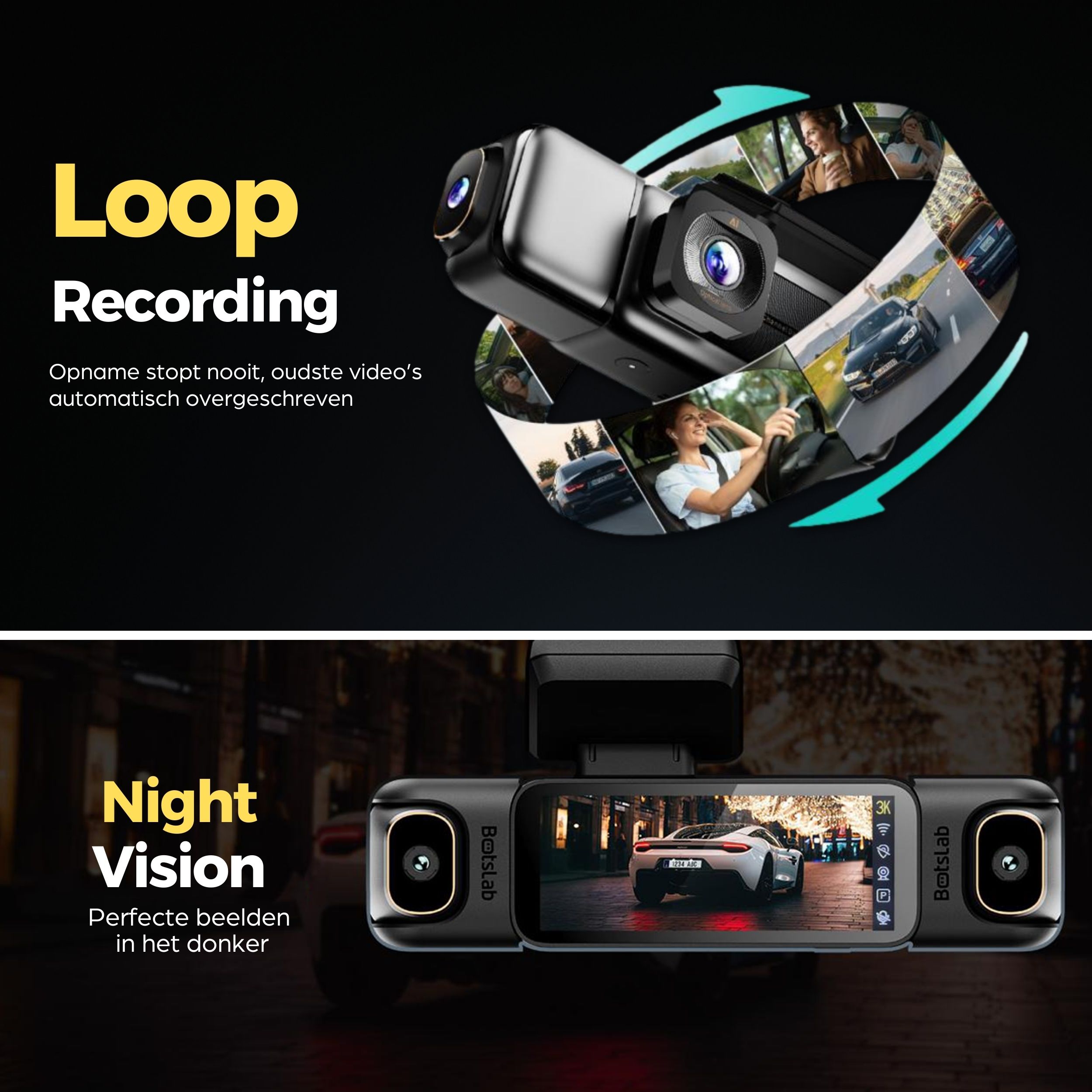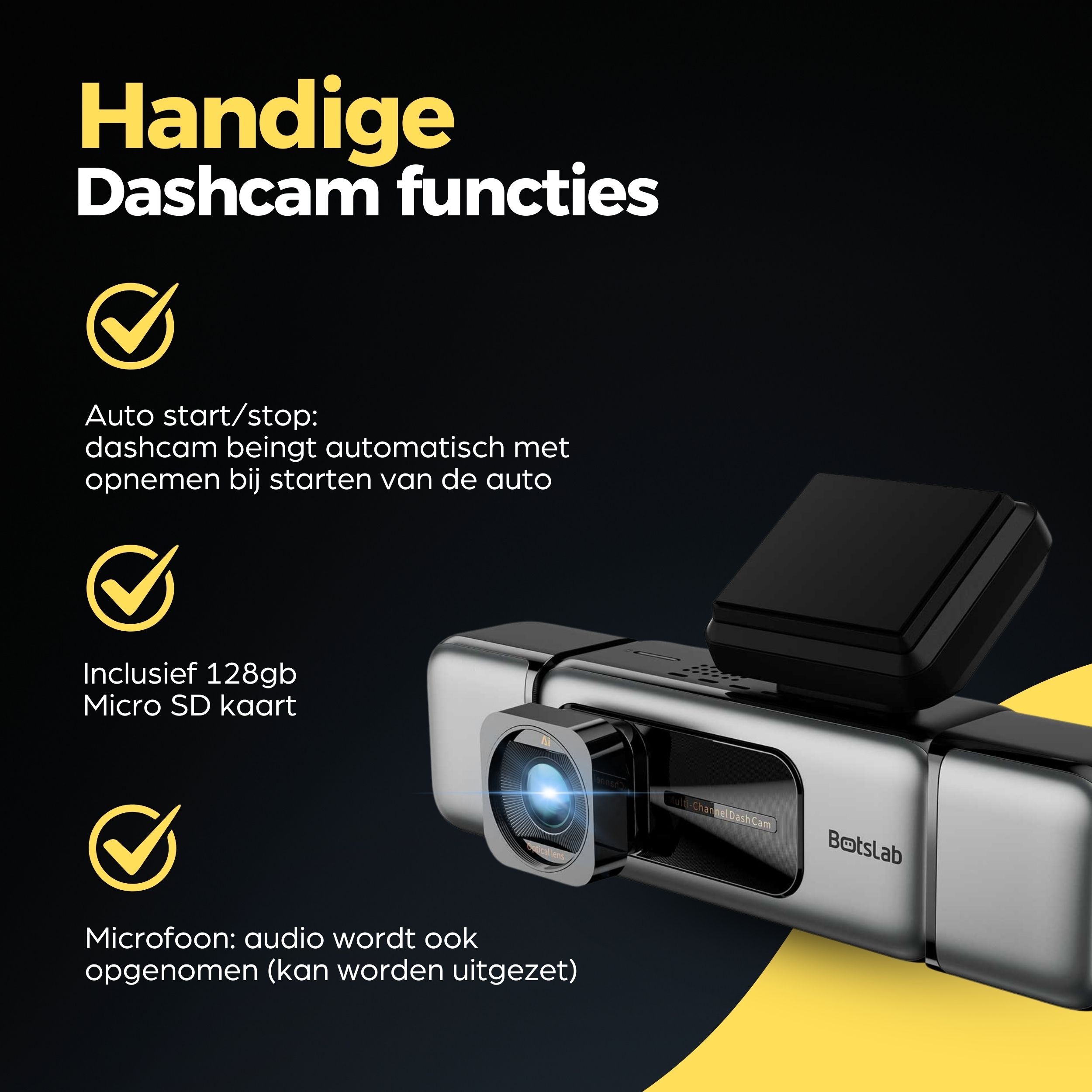 De Botslab G980H Pro 4CH is een 4-kanaals dashcam die werkelijk alles in en rondom de auto opneemt. Je mist helemaal niets meer door de vier afzonderlijke camera's. De camera's aan de voor- en achterkant filmen de weg en de twee camera's aan de zijkant kun je in elke gewenste richting positioneren. 4-kanaals opname Het unieke van deze Botslab G980H Pro 4CH dashcam zijn de vier afzonderlijke camera's. De hoofdunit die op de voorruit wordt bevestigd is uitgerust met een 4K camera die de weg filmt. Aan de zijkanten zitten twee draaibare camera's die in alle richtingen kunnen worden gedraaid. De G980H Pro 4CH is hierdoor de ideale dashcam als parkeerbeveiliging voor je auto. Full HD achter camera De Botslab G980H Pro 4CH wordt geleverd met Full HD achter camera om ook achter de auto op te kunnen nemen. De camera wordt met een lange kabel van 6 meter verbonden met de voorste camera en ze nemen alles tegelijk op. Bij aansluiting van de achter camera wordt de resolutie van de voorste camera naar 3K bijgesteld. Sony Starvis sensor De Botslab G980H Pro 4CH maakt geweldige opnames door gebruik van de Sony beeldsensoren. Deze super krachtige sensoren garanderen de scherpste beelden en zijn met name in het donker van hoge kwaliteit. De video's worden opgenomen in 3K resolutie in aan de voorkant en FullHD voor het interieur en de achterkant. Zelfklevende bevestiging Deze Botslab G980H Pro 4CH dashcam wordt geleverd met een stevige zelfklevende houder om de camera op de ruit te bevestigen. De camera kan in één schuifbeweging uit de houder worden gehaald en weer worden geplaatst. De dashcam kan hierdoor eenvoudig uit de auto worden gehaald. 3,18 inch touchscreen LCD De G980H dashcam heeft een strak en helder 3,18 inch touchscreen LCD voor eenvoudige bediening. Op het scherm worden live de beelden weergegeven en kunnen instellingen worden gewijzigd. Ook kijk je eenvoudig opgenomen video's terug.