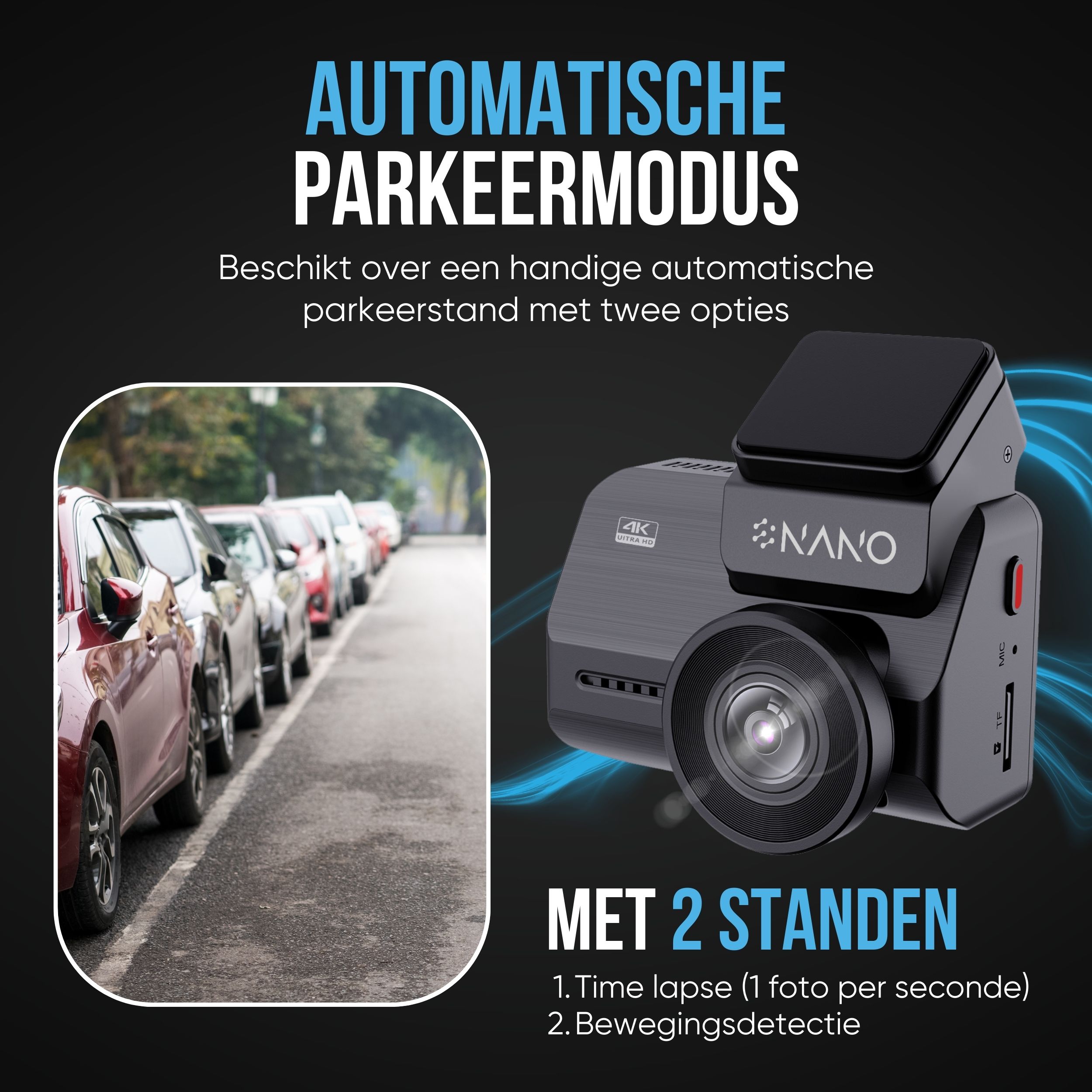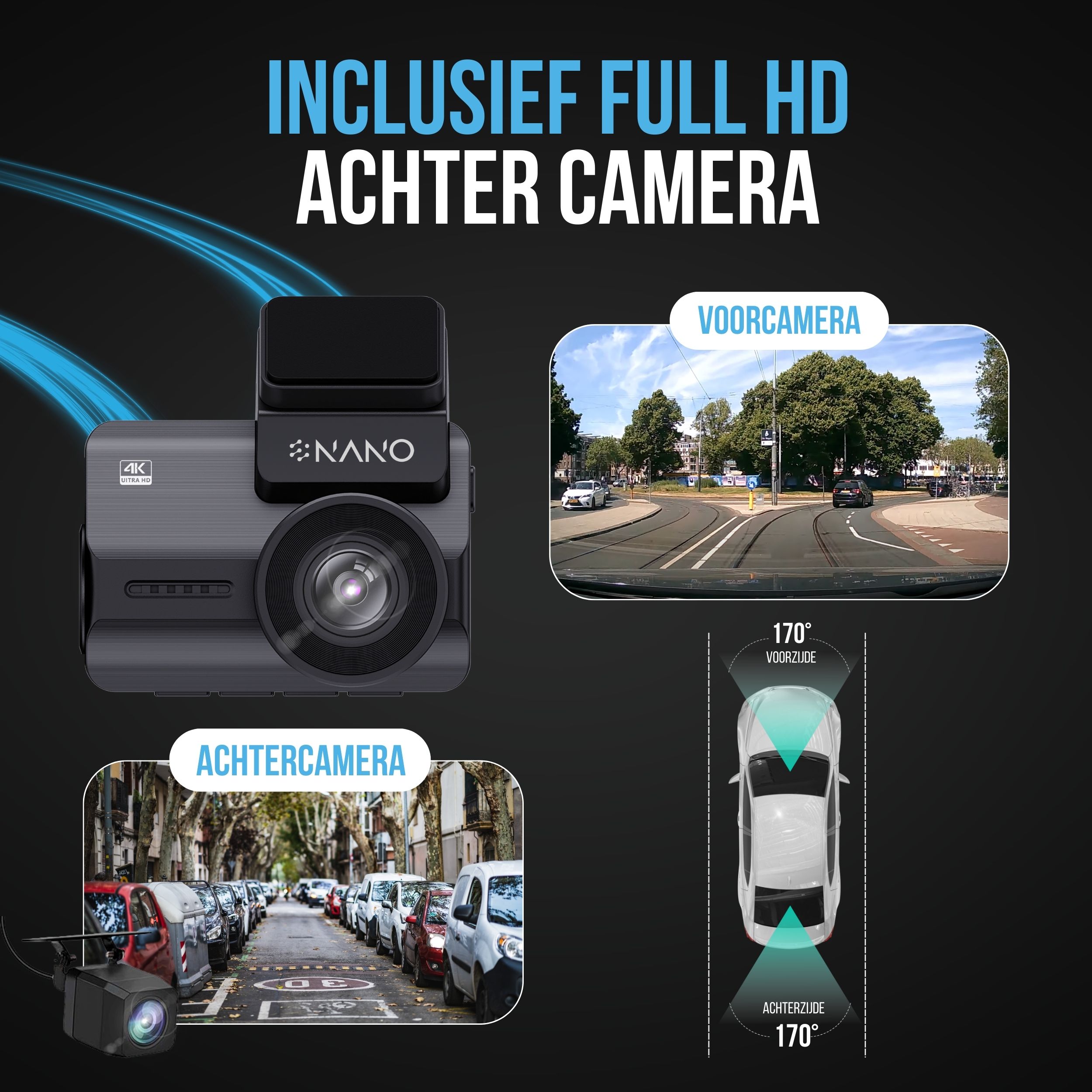 De Nanocam M68 4K dashcam is de perfecte camera om al je ritten in de scherpste beeldkwaliteit vast te leggen. Deze high-end dashcam filmt alles voor en achter je auto en door de handige parkeermodus werkt hij tevens als surveillance camera als je auto geparkeerd staat. Door de ingebouwde Wifi bekijk je de beelden eenvoudig op je telefoon en de GPS houdt de snelheid en locaties van de ritten bij. 4K + FullHD resolutie De Nanocam M68 4K is uitgerust met de recentste Galaxy GC8613 8.0MP beeldsensor die garant staat voor de scherpste Ultra 4K video's met een resolutie van 3840p*2160p in 24fps. De achter camera neemt op in FullHD (1080p) resolutie. De HDR technologie staat zorgt voor een perfecte beeldkwaliteit bij alle weersomstandigheden. Tevens kan met de dashcam foto's in 18M pixels worden gemaakt. FullHD achter camera De achter camera filmt met FullHD 24fps resolutie en sluit je eenvoudig aan op de voorste dashcam. Hij is verbonden met een lange kabel van 6 meter en de video's worden tegelijkertijd opgeslagen op de SD kaart. De kabel is voor langere voertuigen met 10 meter te verlengen met de optionele 10m verlengkabel. Night vision Door de hoogwaardige 8.0MP beeldsensor zijn de beelden ook in de nacht van de meest gewaardeerde kwaliteit. WDR technologie (Wide Dynamic Range) zorgt ervoor dat het contrast en de helderheid van de beelden optimaal wordt bijgesteld. Inclusief 32gb Micro SD kaart De Nanocam M68 4K wordt standaard geleverd met een 32gb Micro SD kaart zodat je direct kunt beginnen met opnemen. De dashcam ondersteunt ook grotere Micro SD kaarten tot 256gb. Op de meegeleverde 32gb kaart kan in 4K + FullHD voor ongeveer 2 uur aan video's worden opgeslagen. In lagere FullHD + FullHD resolutie en met een 256gb kaart sla je tot wel 26 uur aan video's op. Door de Loop recording worden de oudste beelden altijd automatisch overschreven voor recente waardoor de camera altijd doorgaat met opnemen.