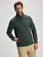 Model donkergroen en denim is 1.90 m lang en draagt maat L.