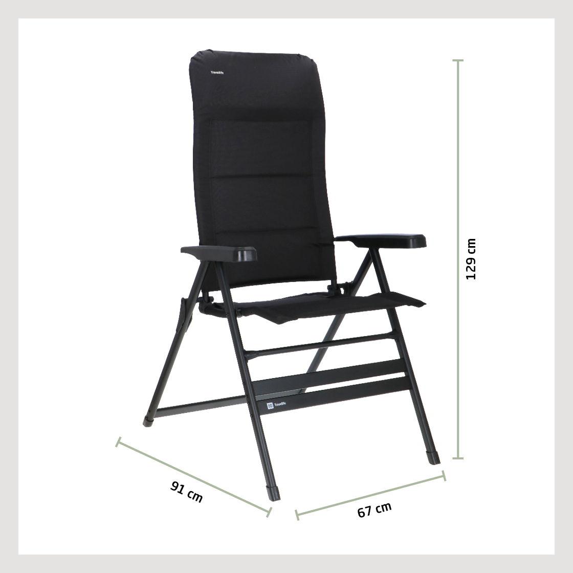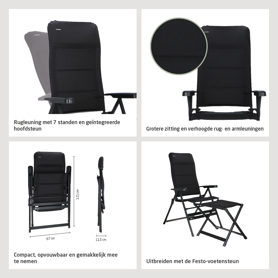 - Ervaar extra ruimte en comfort op de camping of in je eigen achtertuin met de Travellife Festo standenstoel XL graphite black. Deze XL-uitvoering biedt een groter zitvlak, verhoogde rug- en armleuningen en extra versteviging voor een hoger draagvermogen.