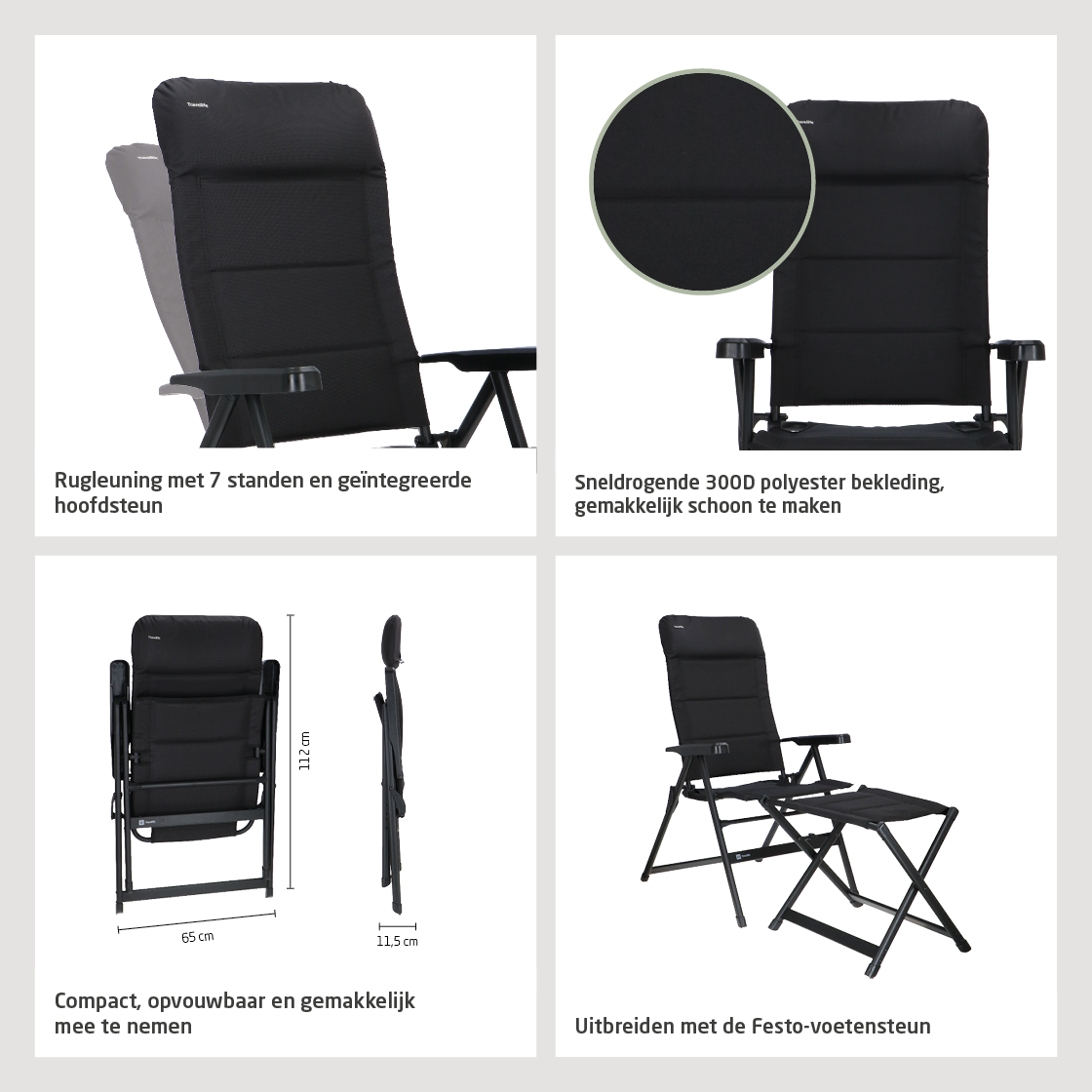 - Ervaar comfort voor op de camping of in je eigen achtertuin met de opvouwbare Travellife Festo standenstoel L graphite black. Dankzij het lichtgewicht frame neem je de standenstoel overal mee naartoe.