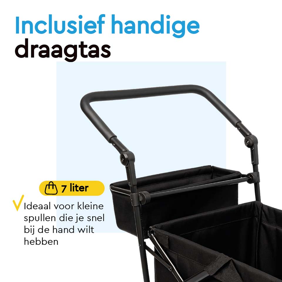 Deze bolderkar is voorzien van een slim inklapbaar harmonicasysteem en is binnen enkele seconden gebruiksklaar. Na gebruik vouw je de kar compact op met het easy‑fold trekkoord. Dankzij het metalen frame en het doordachte ontwerp is de bolderkar eenvoudig te hanteren en op te bergen.