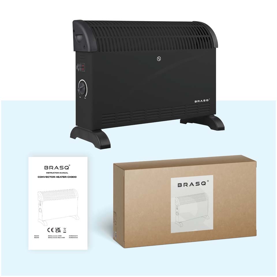 De BRASQ convectorkachel is voorzien van oververhittingsbeveiliging en omvalbeveiliging. Bij oververhitting of omvallen schakelt het apparaat automatisch uit. De IP20‑classificatie maakt hem geschikt voor gebruik in droge binnenruimtes.