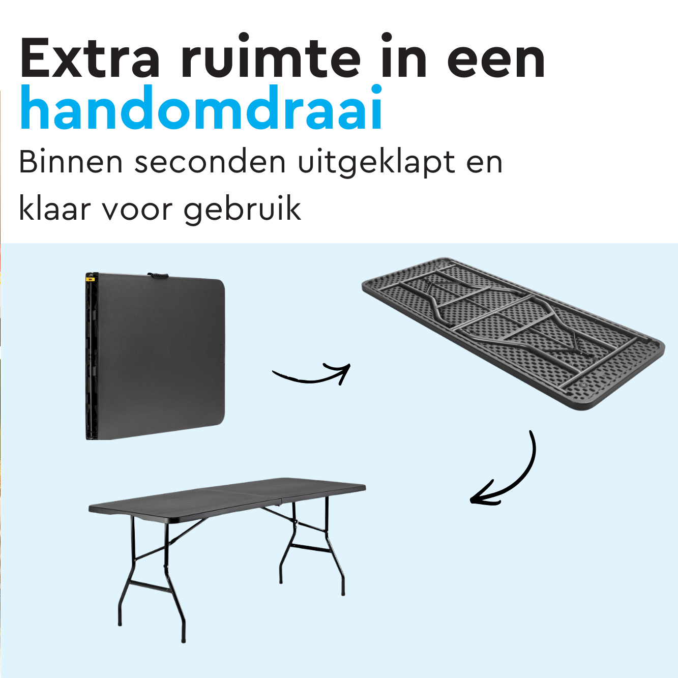Van tuinfeest tot beursstand en van werkplek tot extra eettafel: deze klaptafel voelt zich overal thuis. Het HDPE kunststof blad in combinatie met het stevige stalen buisframe zorgt voor een stabiele constructie en een nette, neutrale uitstraling. De zwarte kleur past moeiteloos in elke omgeving, ongeacht het weer.