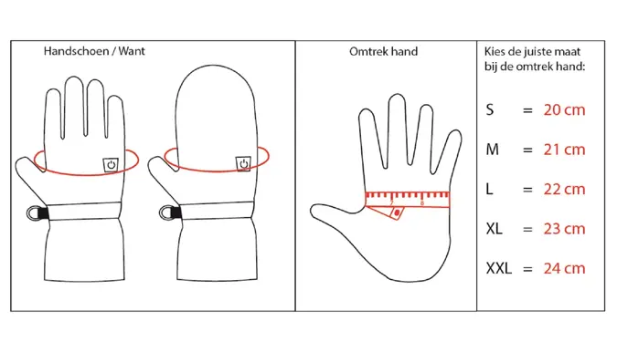 De verwarmingselementen bevinden zich aan de bovenkant van de hand en de vingers en geven dankzij de kleine accu urenlang warmte af. De handschoenen sluiten goed om de polsen (dankzij de rits) om te voorkomen dat er wind naar binnen waait. Om het jou zo comfortabel mogelijk te maken heb je de keuze uit 4 verschillende warmte niveaus.