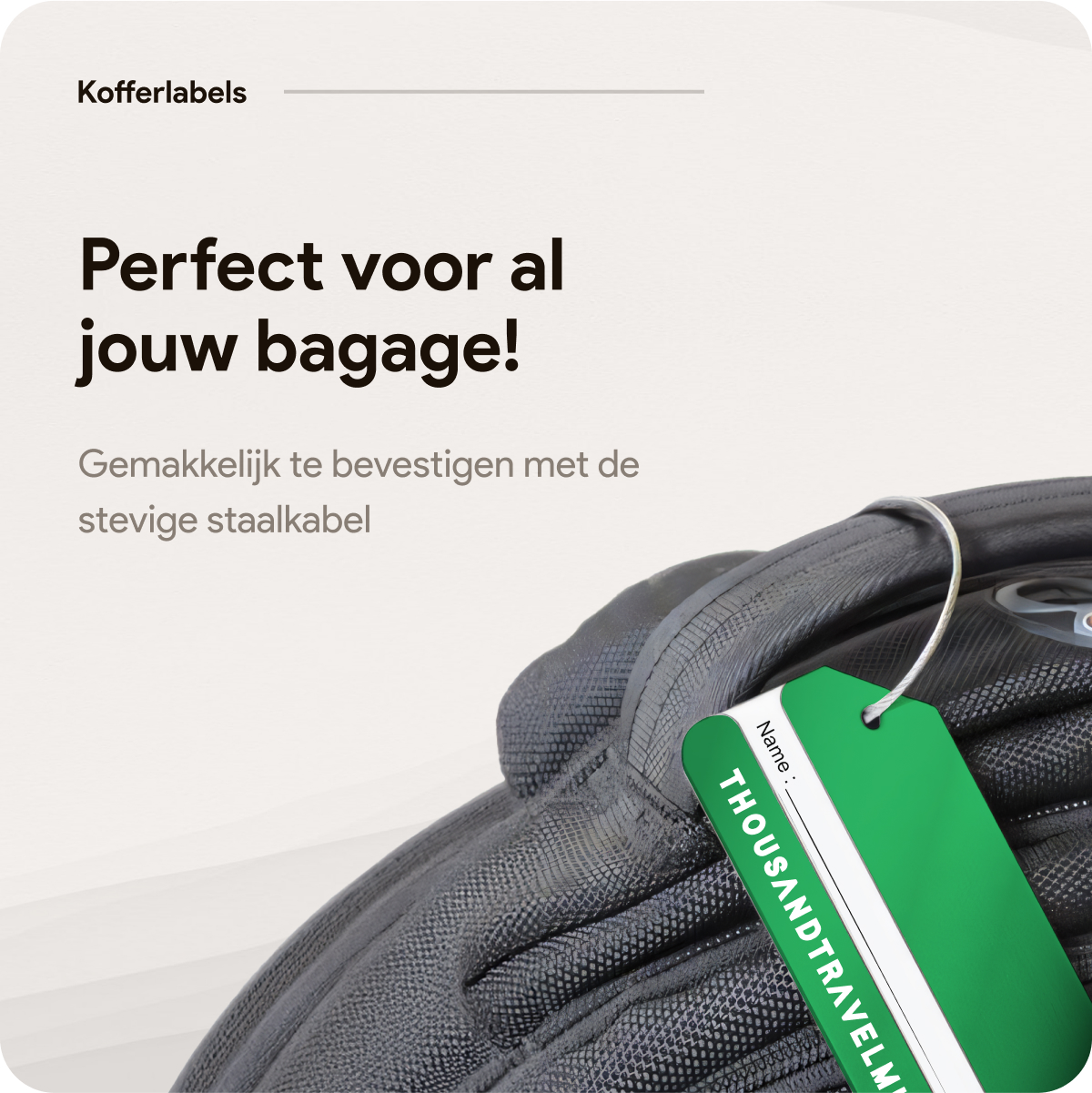 Het naamkaartje is eenvoudig te vervangen door de kabel los te draaien. Hierdoor kun je de labels langdurig blijven gebruiken, ook wanneer gegevens veranderen. De stevige constructie is ontworpen voor meerdere reizen zonder kwaliteitsverlies.